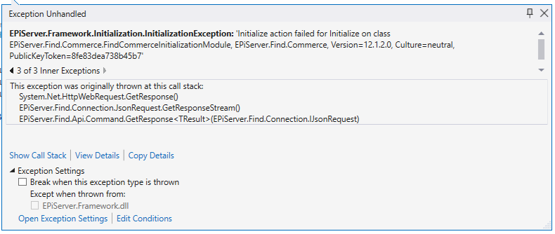 We recommend to fix the following exception, but if you are certain this exception can be safely ignored, add 'episerver:findcommerce.IgnoreWebExceptionOnInitialization' key with value = true to appSettings.