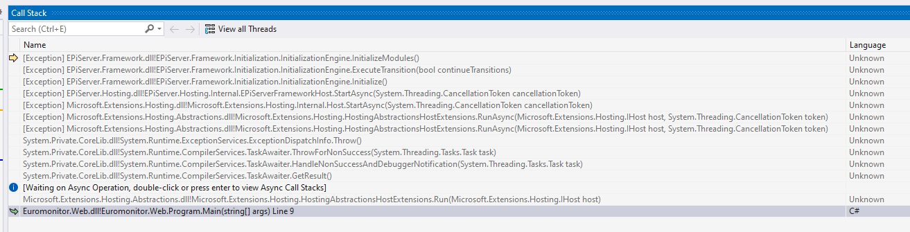 The exception is being thrown by Main method in Program.cs. This is the Call Stack