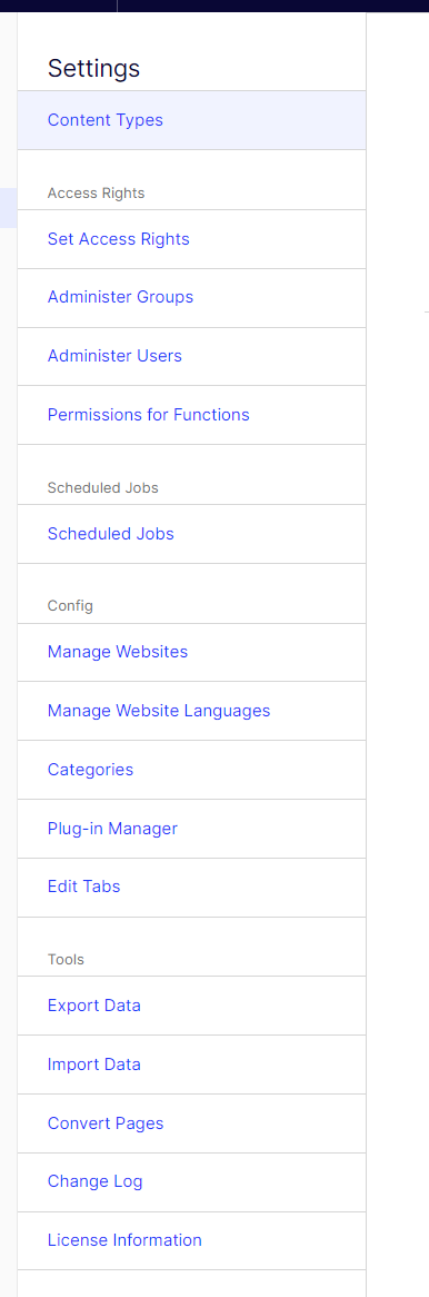 Each of the UrlMenuItem objects above configures a new sub section of the admin area. When this step is completed you should see this in the admin area (note this is a slightly older version before the menu moved to the left