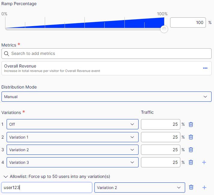 What if I want 100% of traffic to be delivered to a variation with "off" and have another variation "on" that is only for users with Ids 7561 and 2432 for example?