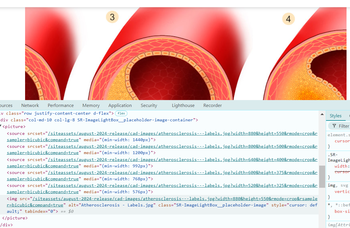 Would it be possible to get a screenshot of the HTML source with the Image or Picture tag in view, for the actual rendered page