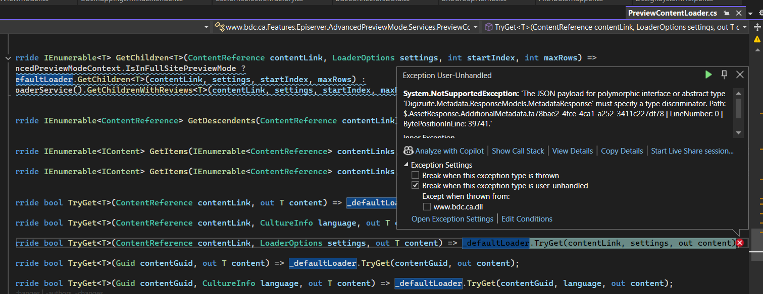 System.NotSupportedException: The JSON payload for polymorphic interface 'Digizuite.Metadata.ResponseModels.MetadataResponse' must specify a type discriminator.Path: $.AssetResponse.AdditionalMetadata.fa78bae2-4fce-4ca1-a252-3411c227df78
