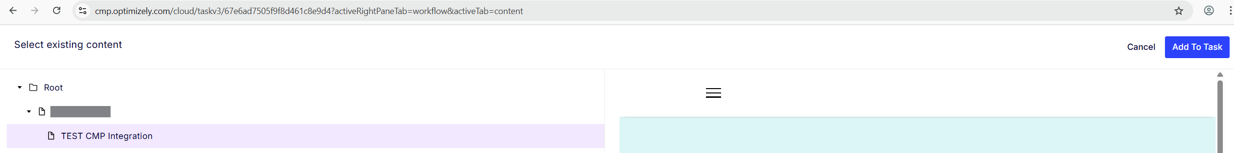 Not sure what's wrong with my integration settings, but the CMS Content Tree actually loaded successfully when I hit "Add Content" button. It just broke after I chose a page and selected "Add To Task".