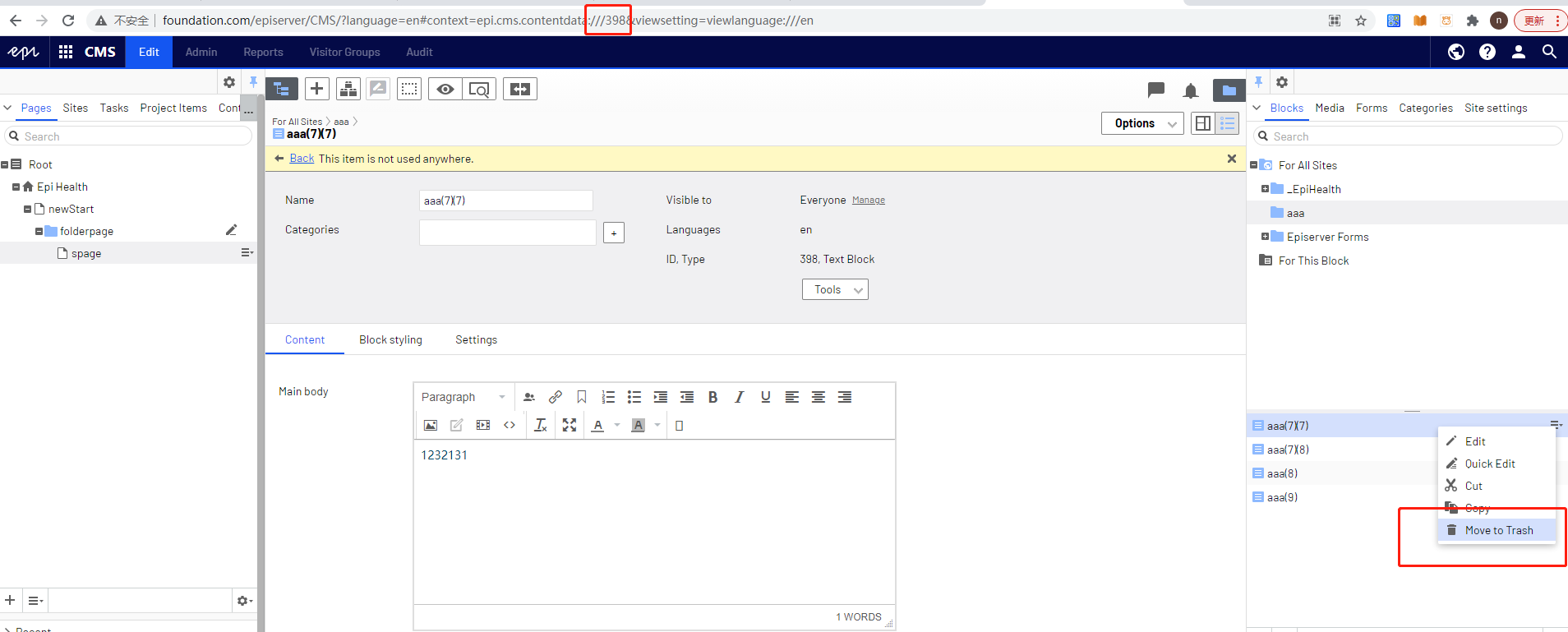 When I am editing a block and then move it to the recycle bin.