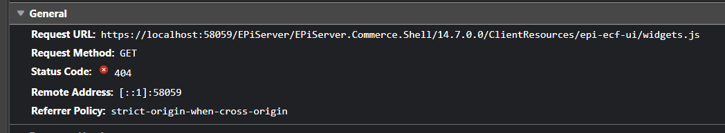 Additionaly in console I have 404 for file https://localhost:58059/EPiServer/EPiServer.Commerce.Shell/14.7.0.0/ClientResources/epi-ecf-ui/widgets.js