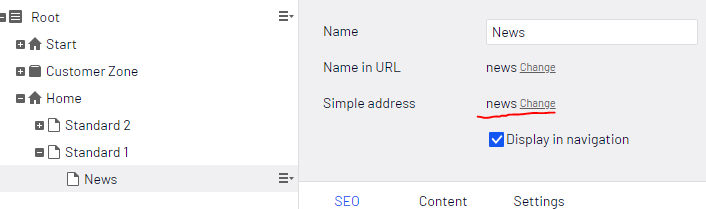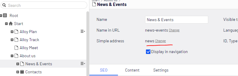 On the Alloytec1 site, go to Start > About us > News & Events. Add a Simple Address 'news' to the page