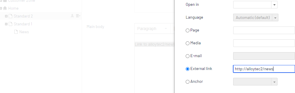 Now on the Alloytec2 site, add another standard page and add an External Link to its Main Body property. The external link URL should be 'http://alloytec2/news'. Yes, this isn't technically an external link, however copying and pasting a URL string into the 'External Link' field can be easier than selecting a deeply nested page from the 'Select Page' dialog tree view.