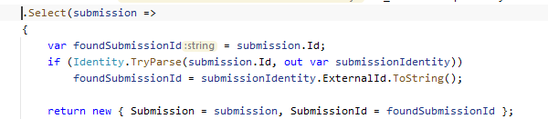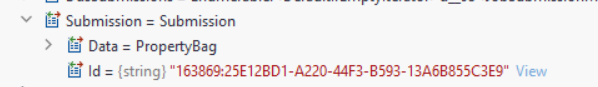 We use IFormRepository.GetSubmissionData to obtain the submission data from Episerver Forms. We pass an array of Guid in strings, which works, the API returns us the related data. Though, under the Submission object, we would expect the Id string property to return the same thing as we initially passed to the method GetSubmissionData, but it's not. It's prefixed with an integer, then we can view the Guid: