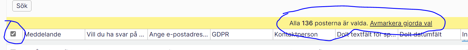 When in the UI trying to export data from a form, there seems to be an issue with the count of the selection info when clicking the checkbox for ”Choose all posts”. It only includes the visible rows (the one you see without scrolling on the page) and the text says that ”All X posts are marked”, but when you scroll down the page – there can be more rows than you dont see before you scroll. When scrolling, the countnumber also increases in the selection info area.