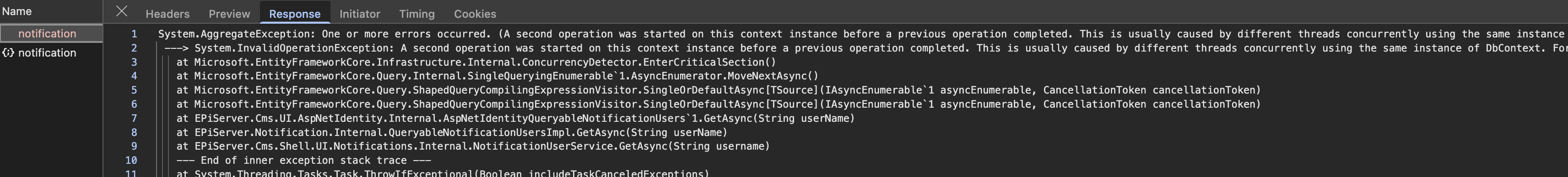 It seems like the CMS reuses the DbContext incorrectly when loading notifications. I get a 500 status code response on every page load in the CMS. Another request is made when manually opening the notifications panel and that request is successful: