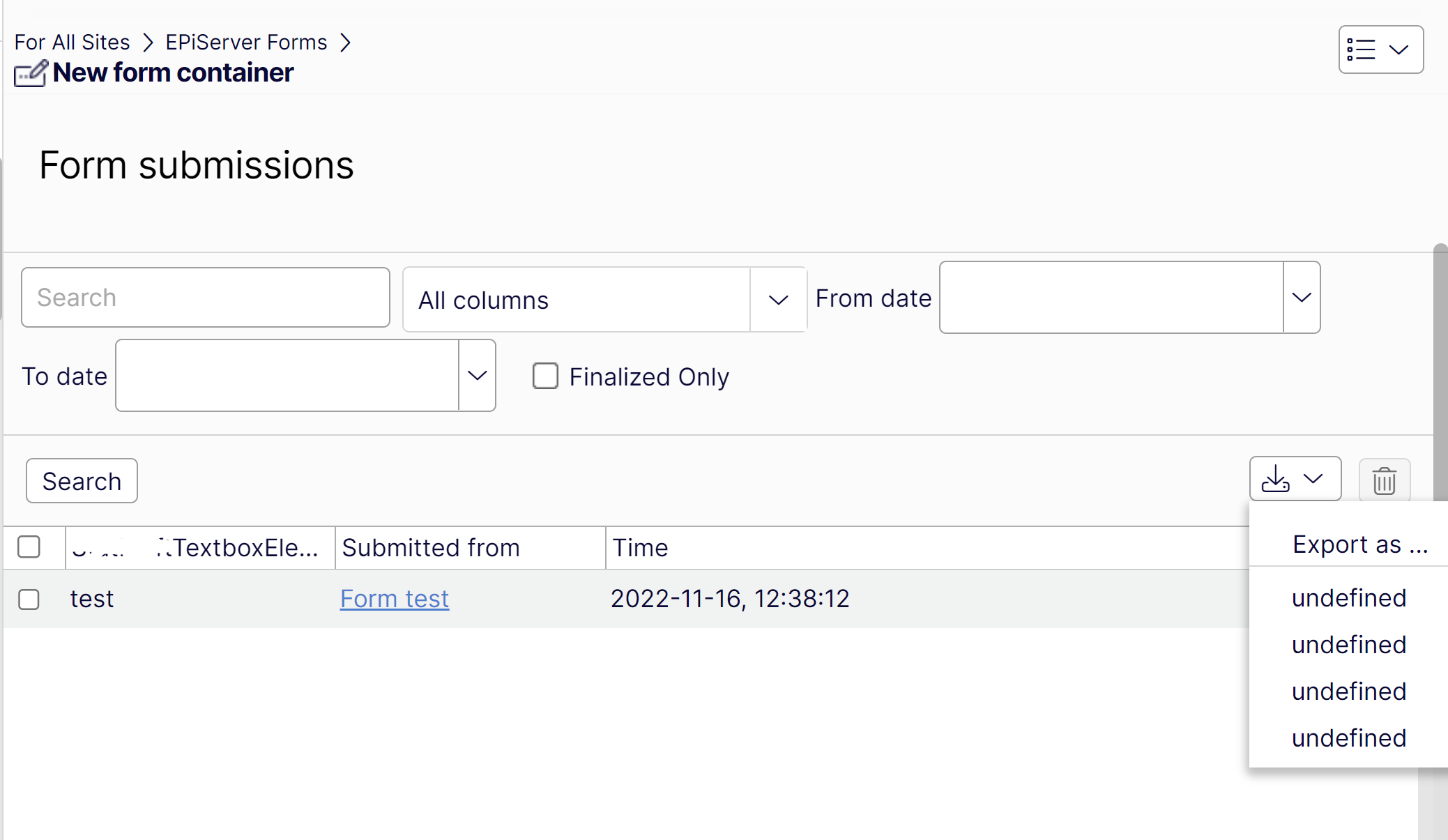 After upgrading to cms 12, its no longer possible for us to export form submissions. The export options are all 'undefined', and if clicked all of them makes a txt file that will fail to download.