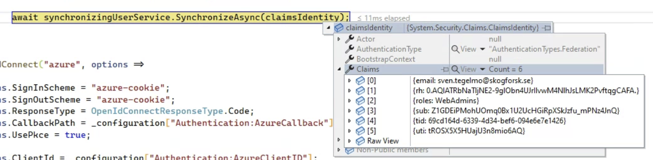 I can see the role in where await synchronizingUserService.SynchronizeAsync(claimsIdentity);