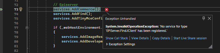 If seems you have a problem with circular reference. Your startup tries to add Commerce, which adds Cms, which adds CmsHost, which initializes your site, and try to initialize some attributes, which tries to get an instance of IClient, which will not be registered until you call AddFind().