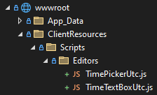 I think your issue is path related. The path for dojo "EpiK" should be "Scripts" without slash. For client resources path should be "Scripts/Editors/TimeTextBoxUtc.js" same as the other one.
