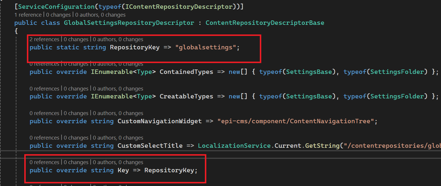 The repositoryKey value is "globalsettings" which comes from a descriptor that implements ContentRepositoryDescriptorBase is decorated with [ServiceConfiguration(typeof(IContentRepositoryDescriptor))]
