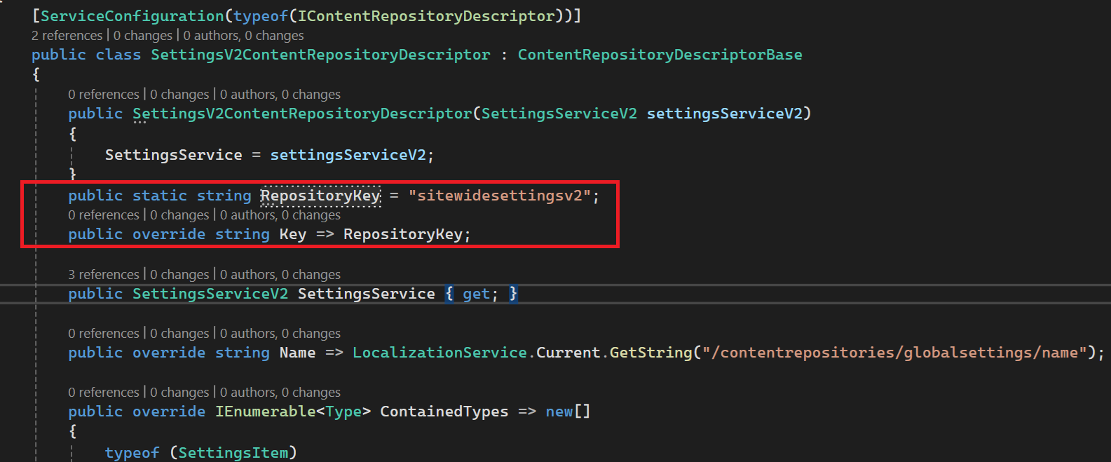 Settings.Add(new Setting("repositoryKey", SettingsV2ContentRepositoryDescriptor.RepositoryKey));