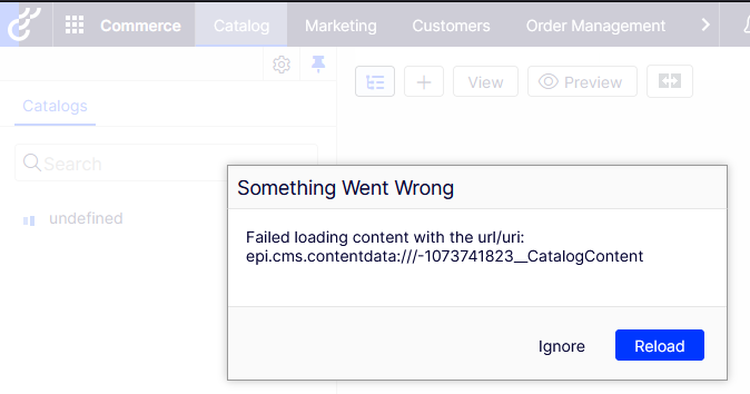 Object { message: "Unable to load /EPiServer/shell/Stores/context/?uri=epi.cms.contentdata%3A%2F%2F%2F-1073741823__CatalogContent status: 404", stack: "_317@https://cmsurl.se/EPiServer/Shell/12.21.0/ClientResources/dojo/dojo.js:15:78148\n_4f2@https://cmsurl.se/EPiServer/Shell/12.21.0/ClientResources/dojo/dojo.js:15:133806\n_4fe@https://cmsurl.se/EPiServer/Shell/12.21.0/ClientResources/dojo/dojo.js:15:134085\nEventListener.handleEvent*_4f8@https://cmsurl.se/EPiServer/Shell/12.21.0/ClientResources/dojo/dojo.js:15:134369\nxhr@https://cmsurl.se/EPiServer/Shell/12.21.0/ClientResources/dojo/dojo.js:15:135460\ndojo/_base/xhr/</dojo.xhr@https://cmsurl.se/EPiServer/Shell/12.21.0/ClientResources/dojo/dojo.js:15:124996\n_sendRequest@https://cmsurl.se/EPiServer/Shell/12.21.0/ClientResources/epi/shell/widgets.js:2:345594\nepi/shell/request/Extender/</xhr/<@https://cmsurl.se/EPiServer/Shell/12.21.0/ClientResources/epi/shell/widgets.js:2:345194\ndojo/_base/lang/</hitch/<@https://cmsurl.se/EPiServer/Shell/12.21.0/ClientResources/dojo/dojo.js:15:30941\n_2f2@https://cmsurl.se/EPiServer/Shell/12.21.0/Cl…", response: {…}, status: 404, responseText: '\r\n\r\n<!DOCTYPE html>\r\n<html lang="en">\r\n<head>\r\n <title>Resource Not Found</title>\r\n <meta charset="utf-8">\r\n <meta http-equiv="X-UA-Compatible" content="IE=edge,chrome=1">\r\n <meta name="viewport" content="width=device-width, initial-scale=1">\r\n <link type="image/x-icon" rel="shortcut icon" href="/Util/images/favicon.ico" />\r\n <link type="text/css" rel="stylesheet" href="/Util/styles/errorpage.css" />\r\n</head>\r\n<body class="epi-workspace">\r\n <div class="error-wrapper">\r\n <div class="friendly-error">\r\n <h1 class="fiendly-error-header">Resource Not Found</h1>\r\n <p class="fiendly-error-content">Unfortunately, the resource you’re looking for couldn’t be found or does not exist anymore.</p>\r\n </div>\r\n </div>\r\n</body>\r\n</html>\r\n', xhr: XMLHttpRequest }