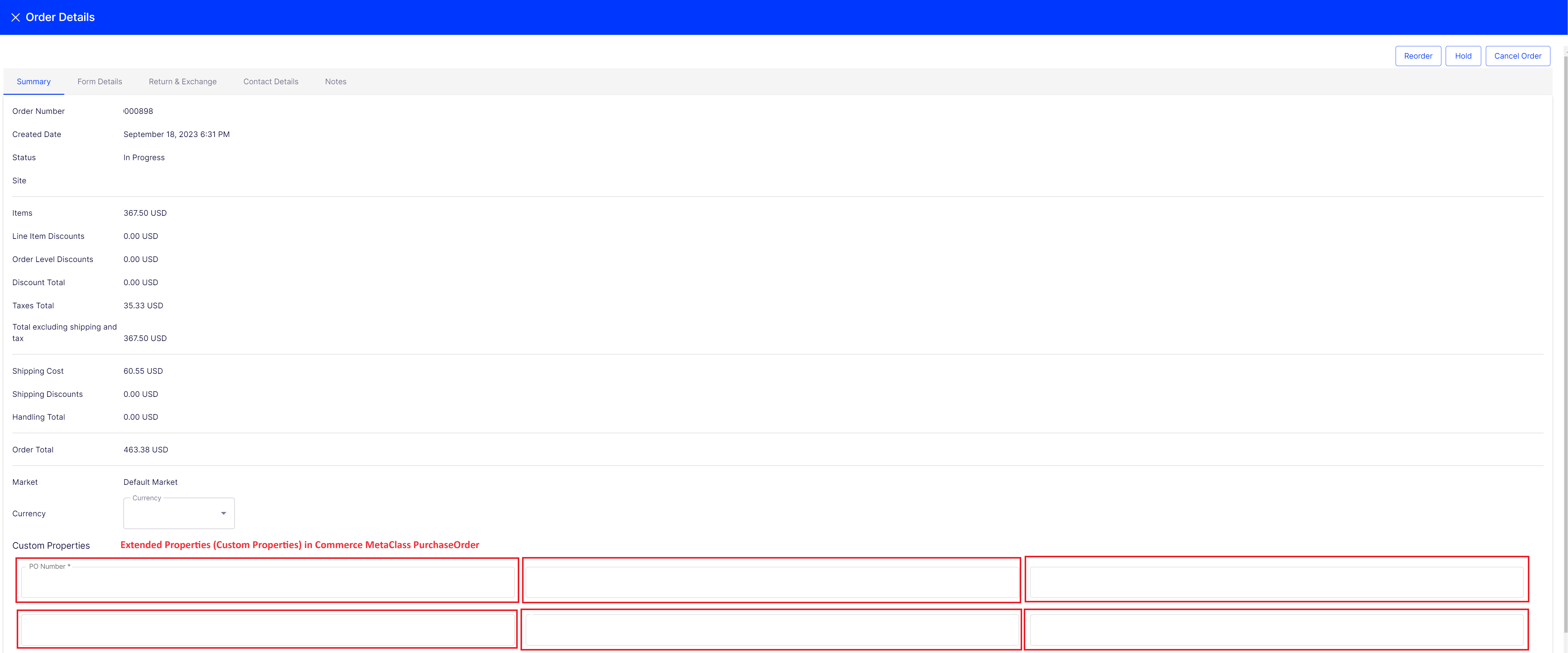 Properties appear in Order Details - Summary at the bottom section and are marked the properties in red.