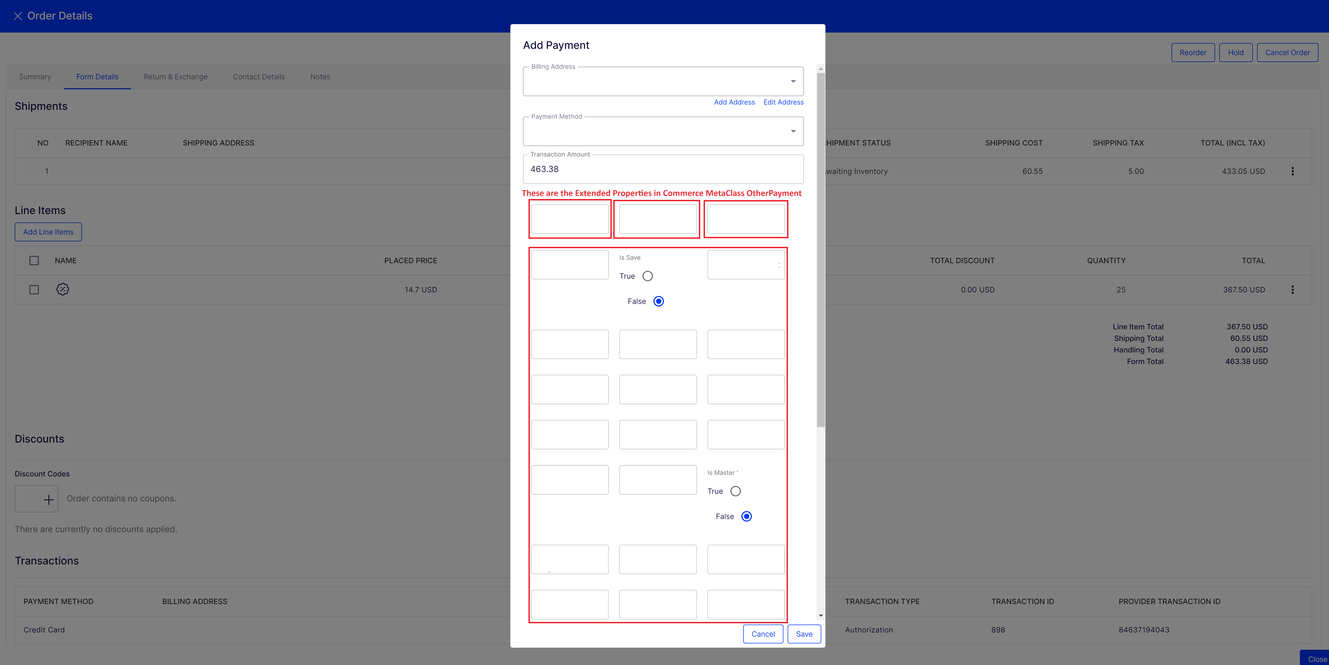 Properties appear in Order Details - Form Details - and click on the Add Payment button under the Transactions section and a popup modal appears as shown in the figure below.