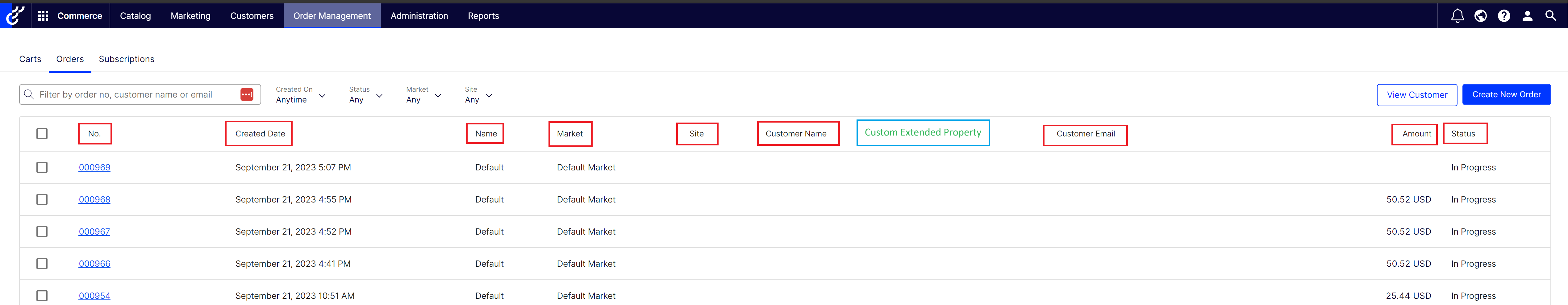 As shown in the given below screenshot the red marked columns are the default commerce properties but marked in the green column is Commerce Extended Property which I want to display in this column, how should I include in the search and sort option? Is there any code example or setting?