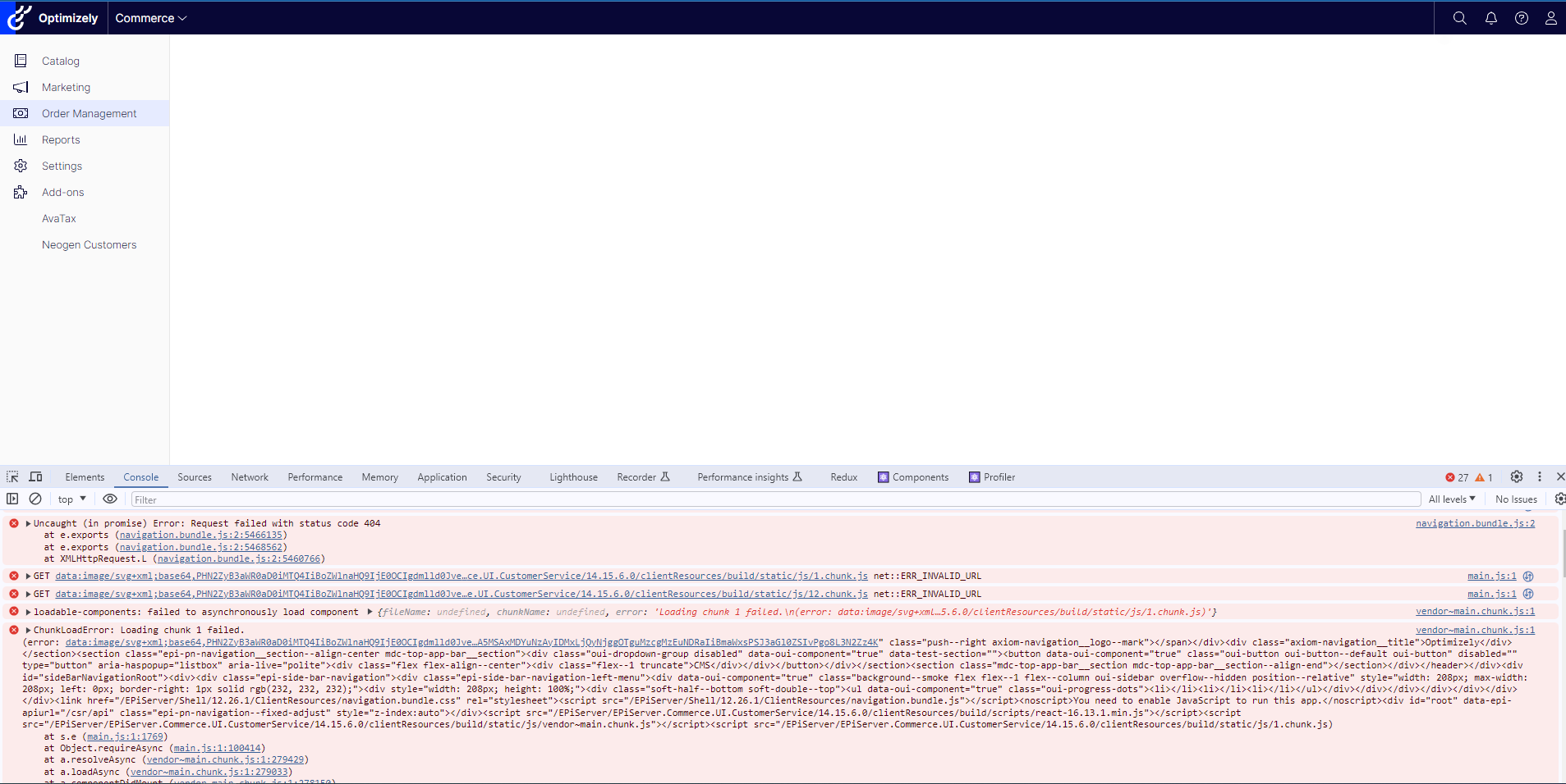 The Order management tab is not working from Commerce screen, we are getting below console errors.