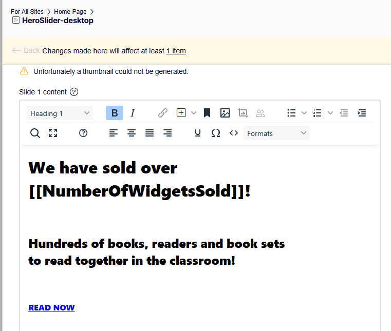 [%NumberOfWidgetsSold%]into the middle of a rich text field and it would pick up the associated content from the Dictionary content (see mocked up screenshot below):...And also have the following within our Razor views: