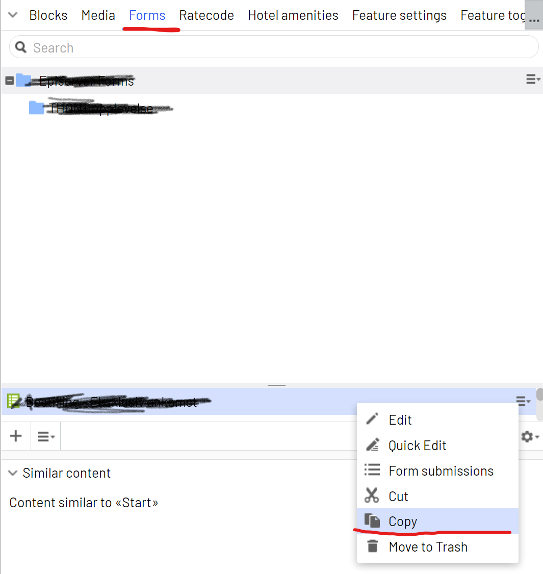 Open the blocks tabs locate the 'Episerver forms' folder and find the form you wish to copy.