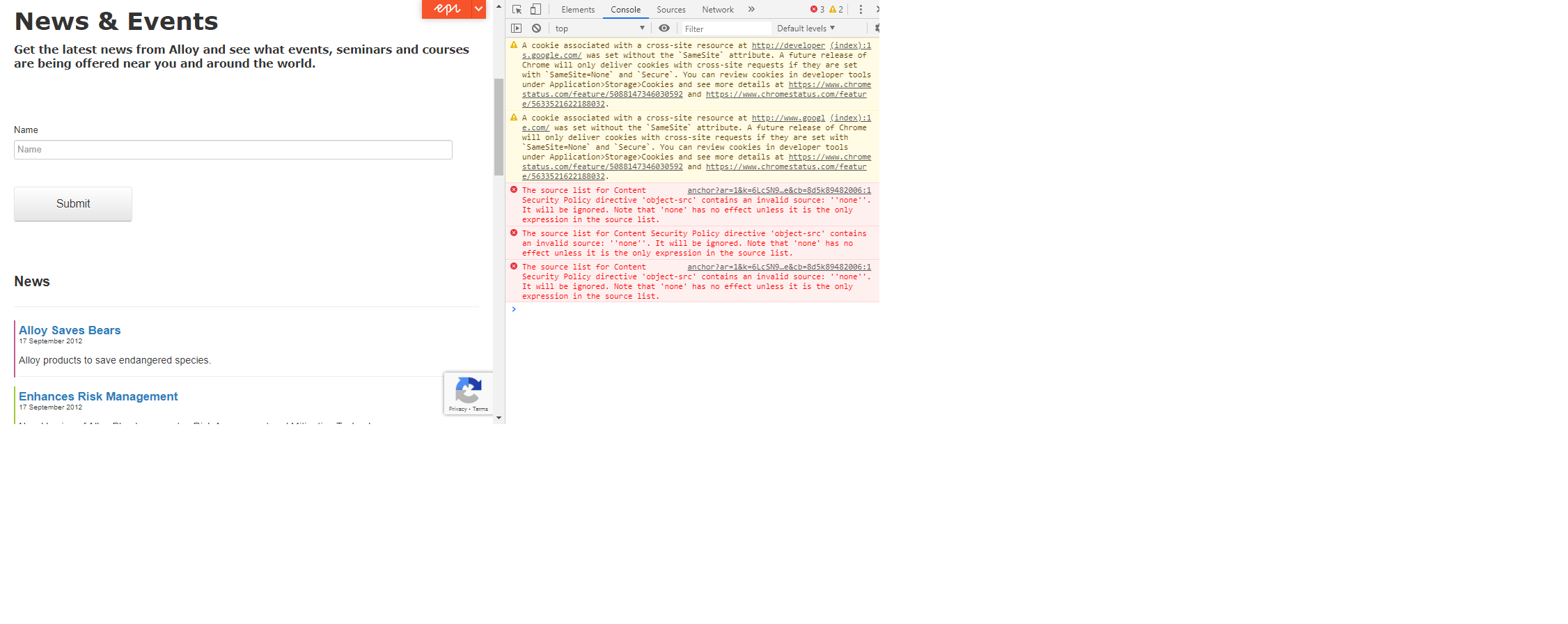 However,when I land on the page where the recaptcha form is,i get an error in console related to content security policy. Assuming ,this might be something restricting on my application site,i tried to implement the same in Alloy site & the issue is still the same.Here's a snap of the error in alloy site.