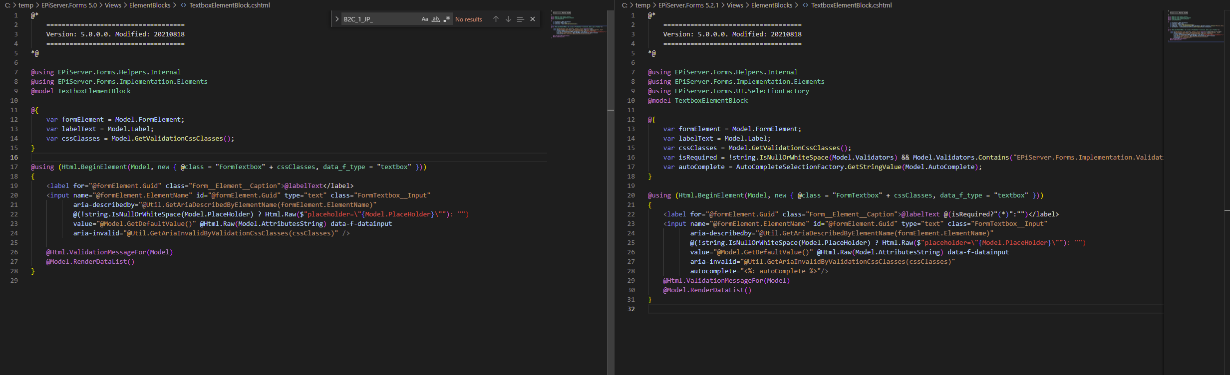 So to check for changes in the original views the Forms developers has tagged each razor view with a version and a modified date. Now the problems is that Optimizely has changes at in least one razor view (the most used one actually) without updating the version and modified date. Below is 5.0 on the left and 5.2.1 on the right. (they added a required * which is a nice feature add btw)