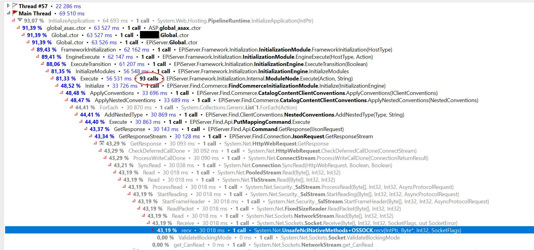 93 is the total calls for initialization modules so that looks reasonable. So it is indeed the slow call to Find. Looks like 30s is the timeout limit.
