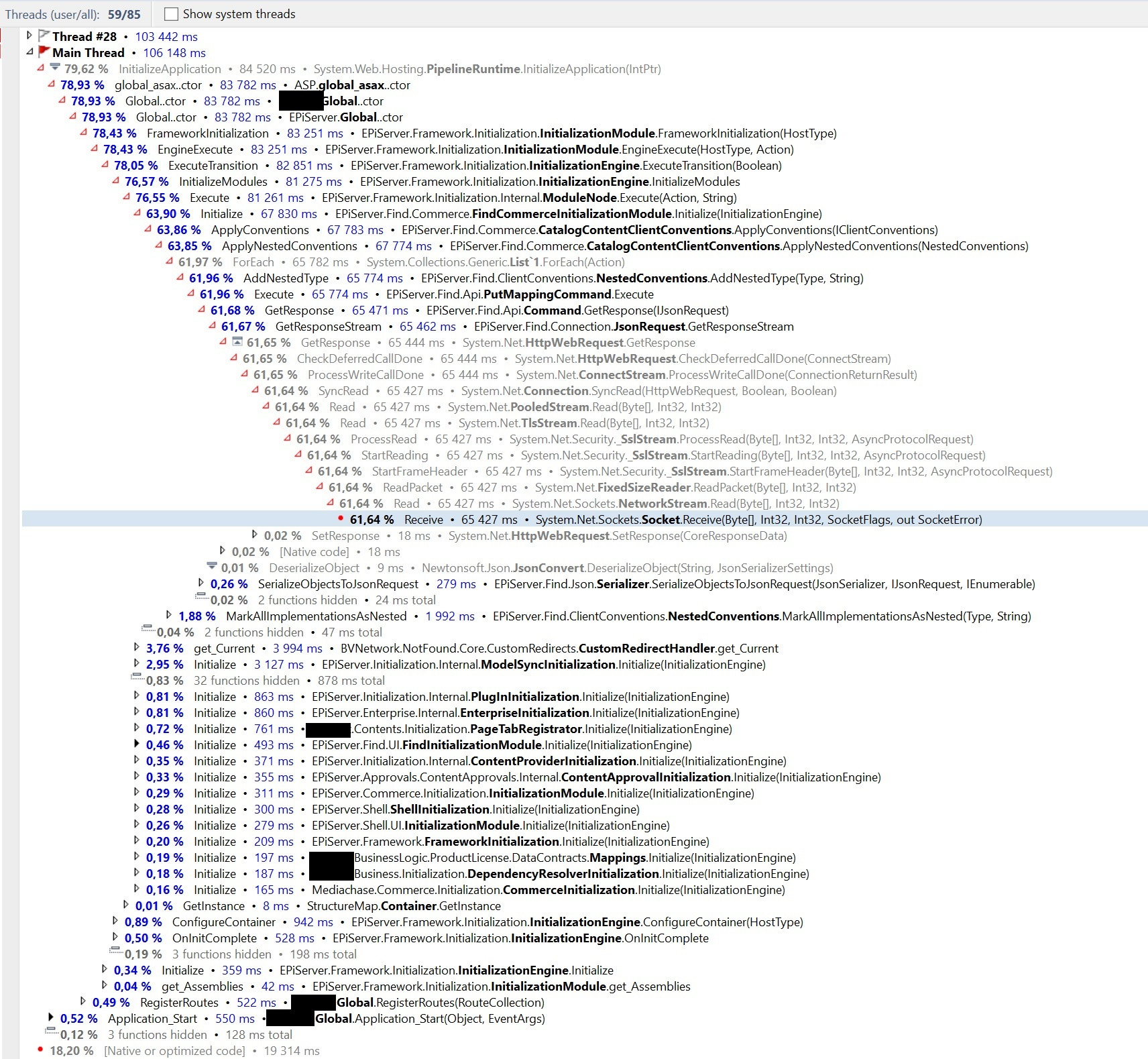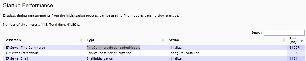 After some issues with very slow startups of a site after building our solution locally, I had a look at the Startup Performance View and learned that the assembly EPiServer.Find.Commerce and type FindCommerceInitializationModule takes over 30 seconds to run, making up a majority of the total startup time of 45 seconds or so. Are there any general things we can do or investigate in order to save time here? The next entry on the list completes in under 4 seconds, so the module really stands out.