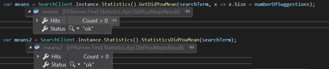 We have implemented "GetDidYouMean" method but it is not giving us the correct results as it is always showing 0 results. We tried both methods as below but response is 0