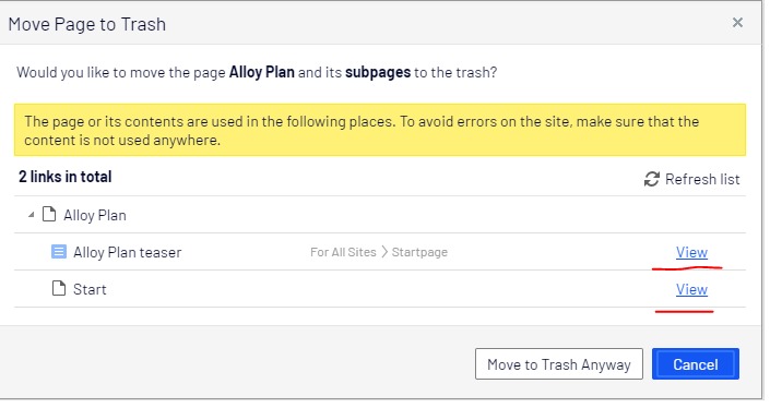 When an editor trying to move a block to trash and then get the pages that the block is used on, is it possible to open the pages in a new tab instead of clicking on view and getting redirected to the wanted page, maybe it It will be really useful for the editor to be able to click on a "View" and the page open on onther window or maybe writing out the link so the editor can copy it and open the page on another window, this will be very user friendly for the cms editors.