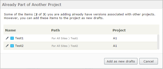 - You can combine these two options. If items included in the translation project are already part of another project, you are notified of this.