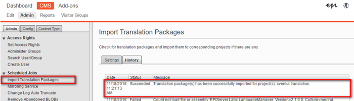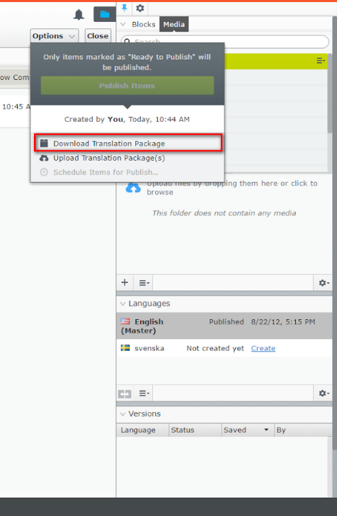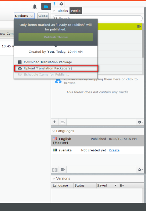 - After adding content to a project and publishing the translation project via the Publish menu, a zip file containing all XLIFF format content is downloaded. Then, you can send the package for translation. When you complete the translations for a project, upload the file (in zip format) to the server to import contents back. The action also is executed via the Publish menu of the Project view. After you upload the packages to the server, they are imported automatically by a scheduled job. If you want to manually start that process, go to admin view > Import Translation Package, and then start it manually.