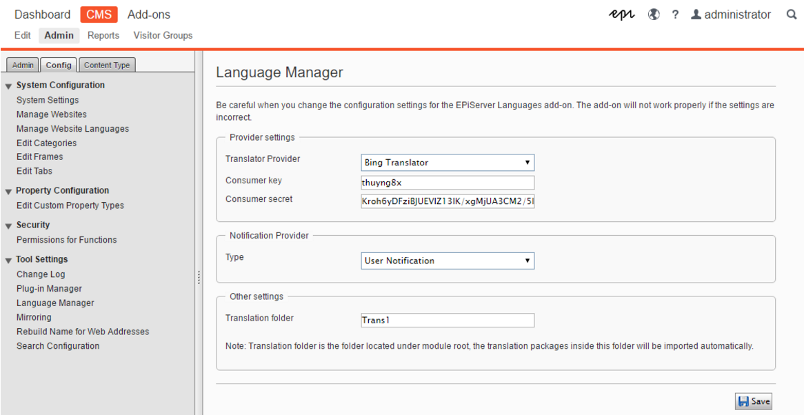 The MachineTranslatorProviders property was removed because it was moved to be stored in DDS. Therefore, the machinetranslatorproviders config element in EPiServer.LanguageManager.config also was removed.