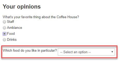 This feature makes it possible to create a customer satisfaction survey that displays additional questions depending on how a visitor answers. So, if a visitor answers "Food" to the question "What's your favorite thing about the Coffee House?", an additional question is displayed, "Which food do you like in particular?". That question is not displayed if the visitor picks any of the other options for the first question. To set up a survey like this, see the draft PDF documentation.
